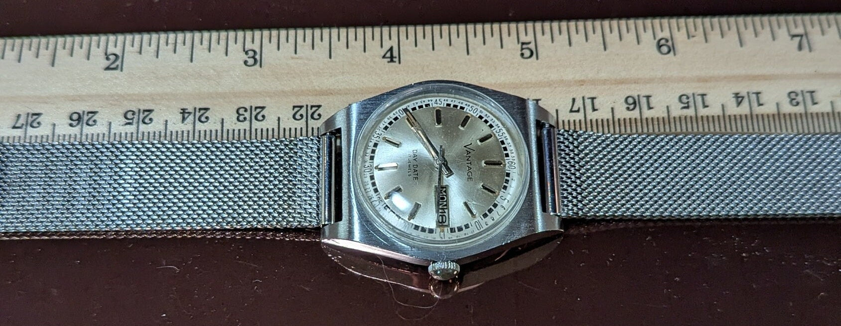 An interesting Vantage Swiss from the 1960s. This is a somewhat rare beast which contains a working Swiss made 17 jewel movement with day and date function. The case is about 37 mm wide with the crown, good for a normal wrist (see pictures). It's a great retro fashion watch that works for casual wear.