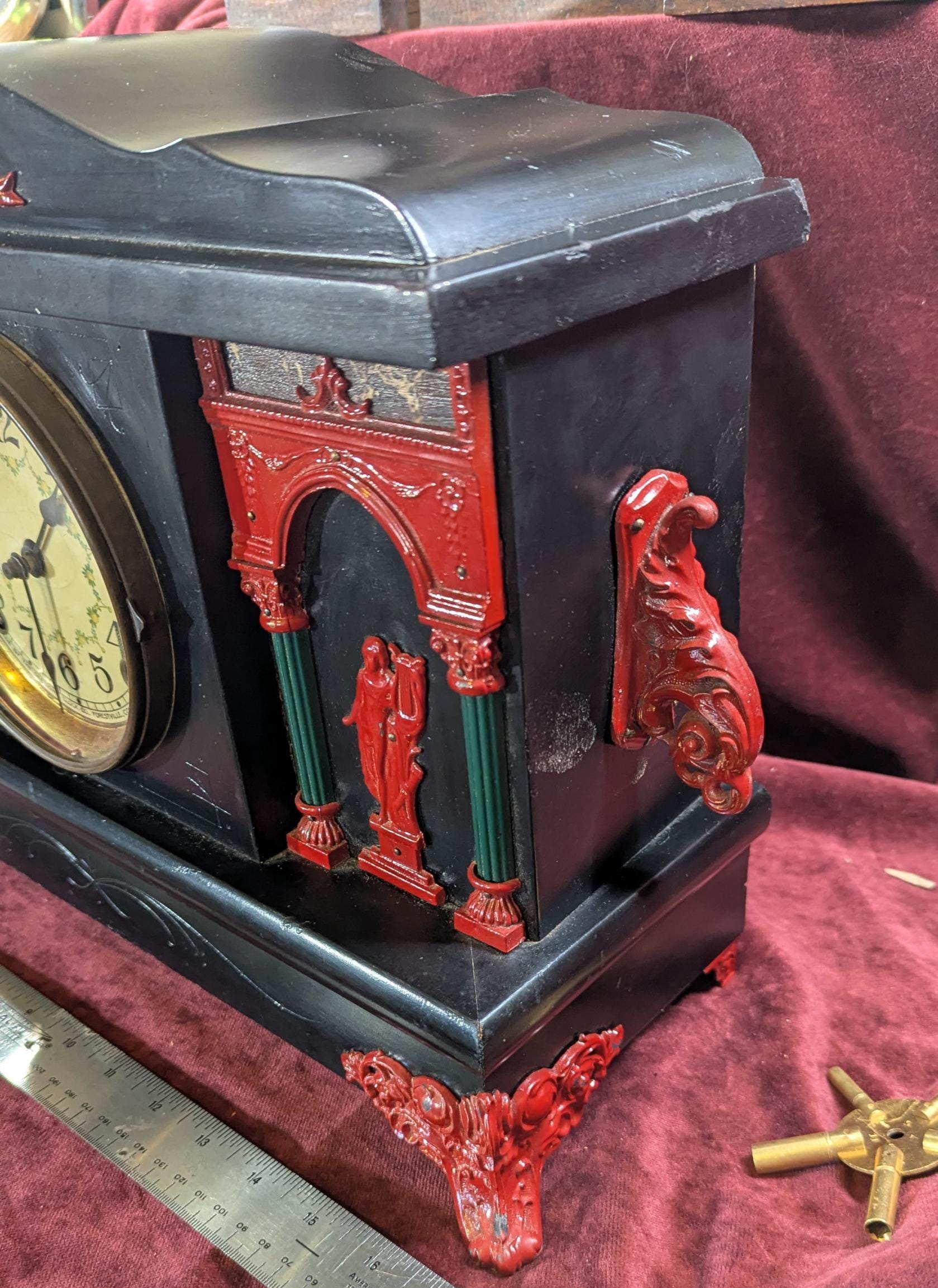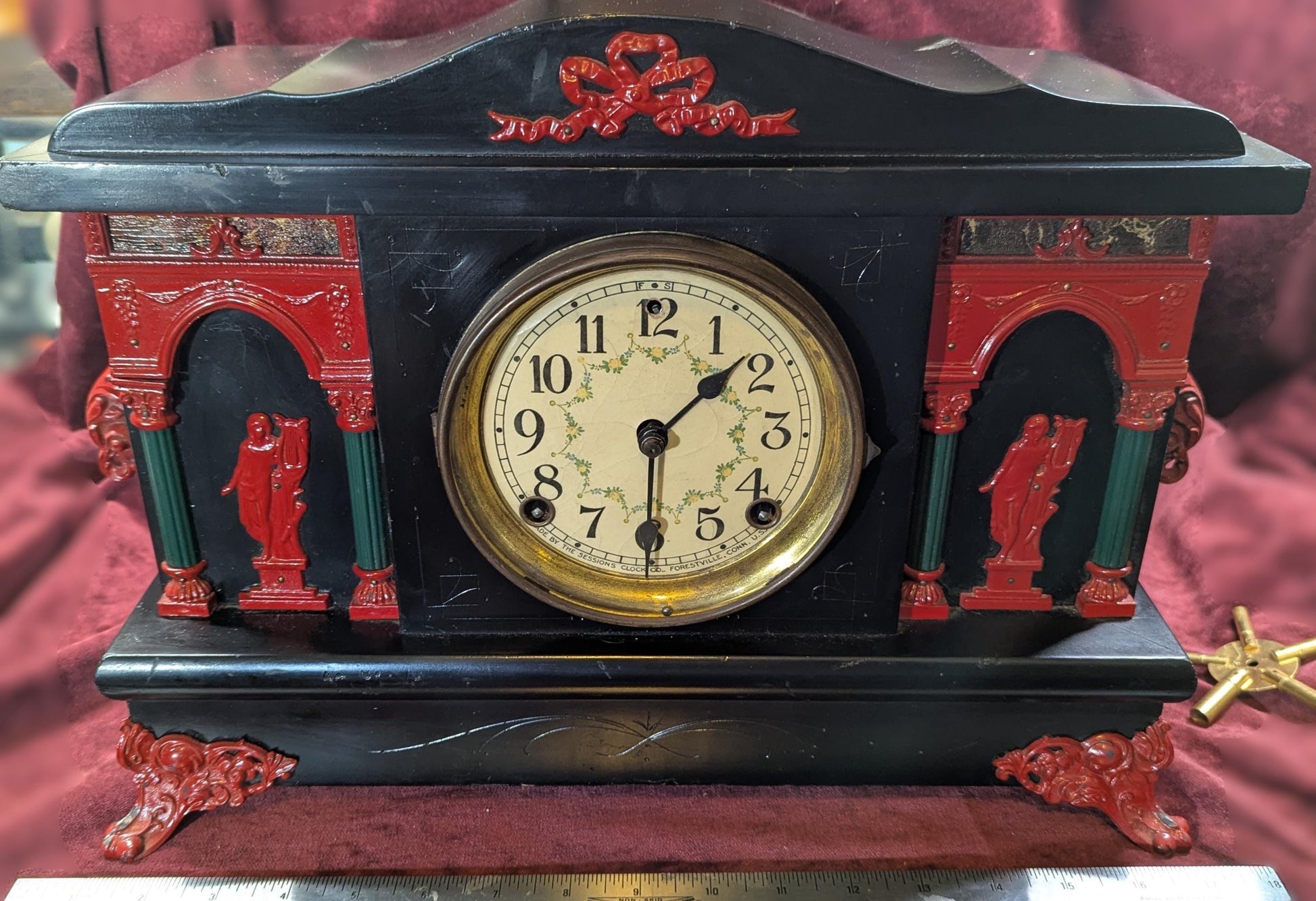 Antique Sessions Mantel Clock: Working Movement with Ebonized Wood, Red Accents, Scroll Feet
