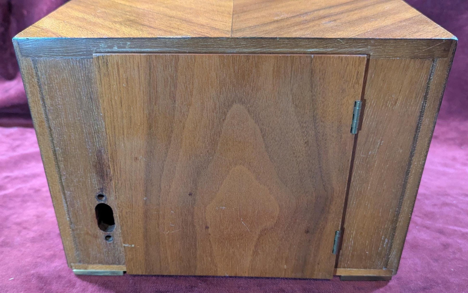 A Fantastic Art Deco Style to grace your home. This Vintage Seth Thomas "Console" Model 4 Desk/Mantle Clock shows the charm and look of the 1930s with beautiful wood veneer and solid brass bezel. The original clock dial shows interesting patina as well. This movement came with a broken mechanical movement which was replaced with a modern quartz movement and new gold colored hands It uses a "AA" battery which is great news for your placement choices around the house. You don't have to worry about plugging it in.
