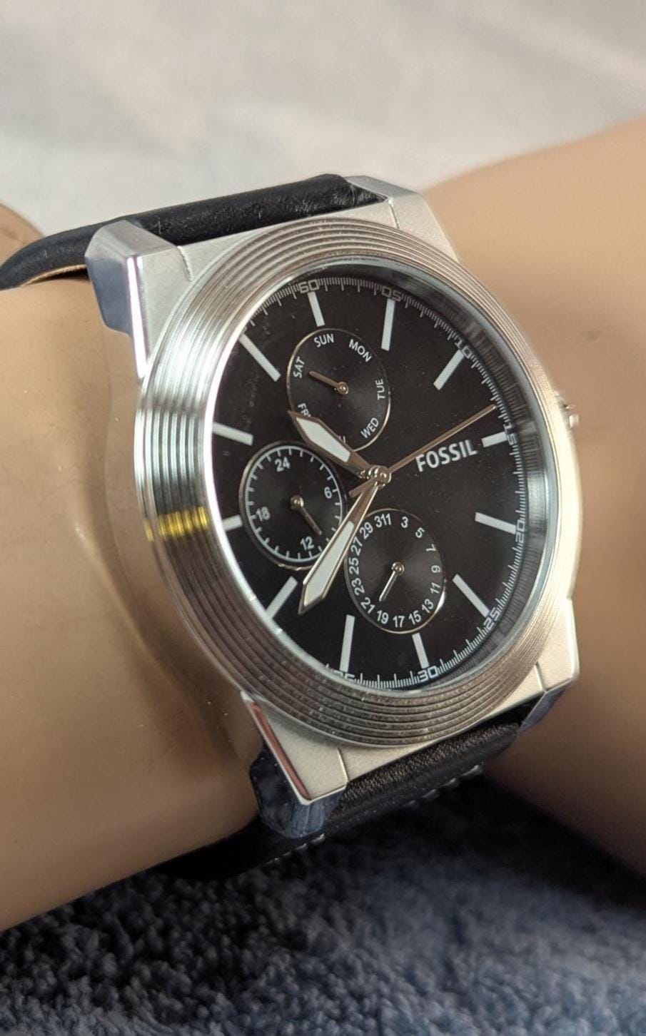 Fossil BQ2334, also known as the Geoff Multifunction, is a men's watch featuring a large 47mm stainless steel case, a black leather strap, and a multifunction quartz movement. This watch is unused, still with original tags and plastic.