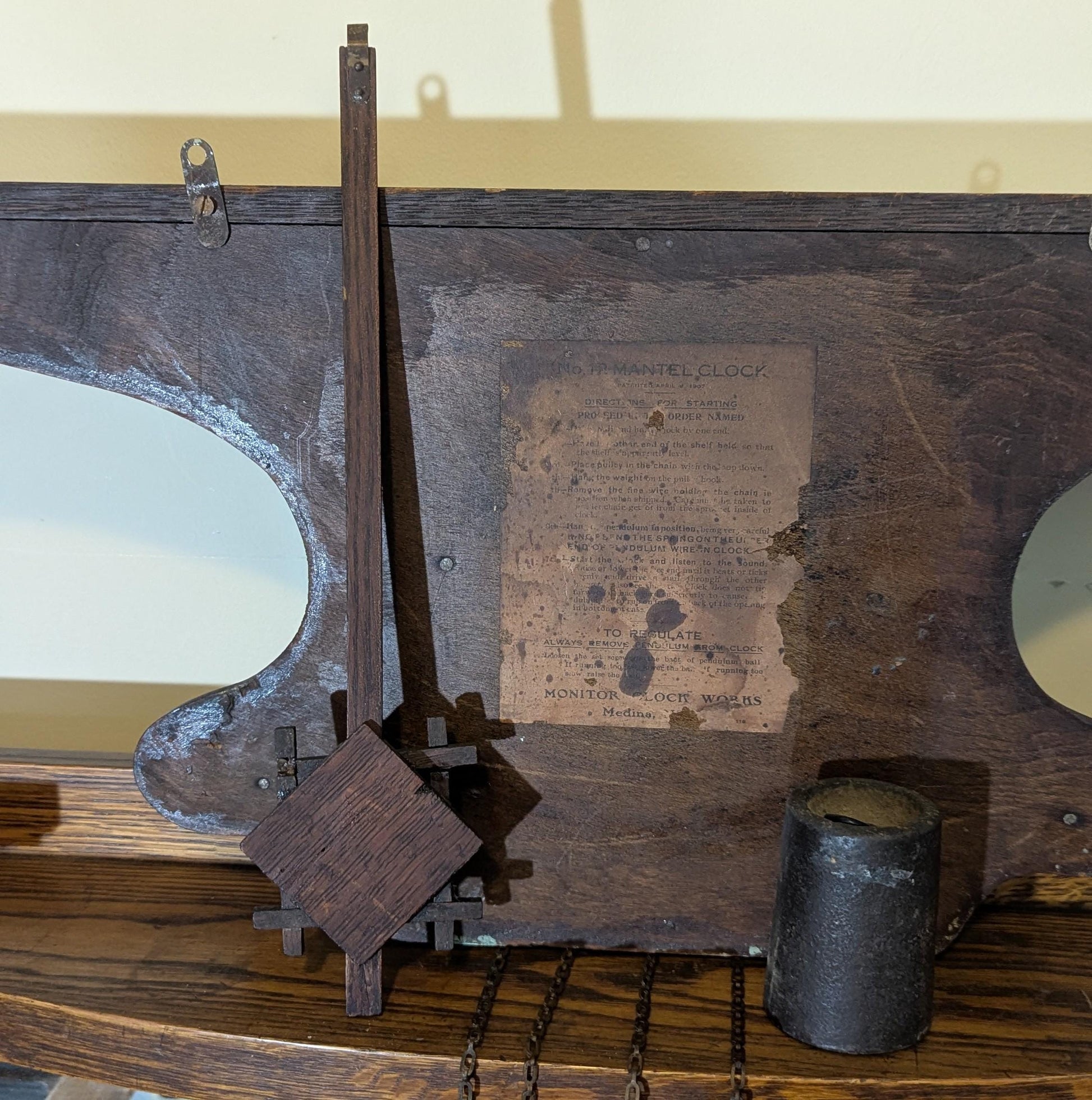 As seen in the pictures, the label retains most of the information and is useful to help validate the date of manufacture. Please see all the photos for what you're getting. The weight is not original but works and matches the weight from the original from what little information I could find. You access the movement from the front (4 screws). I've oiled the original movement which appeared in good condition.