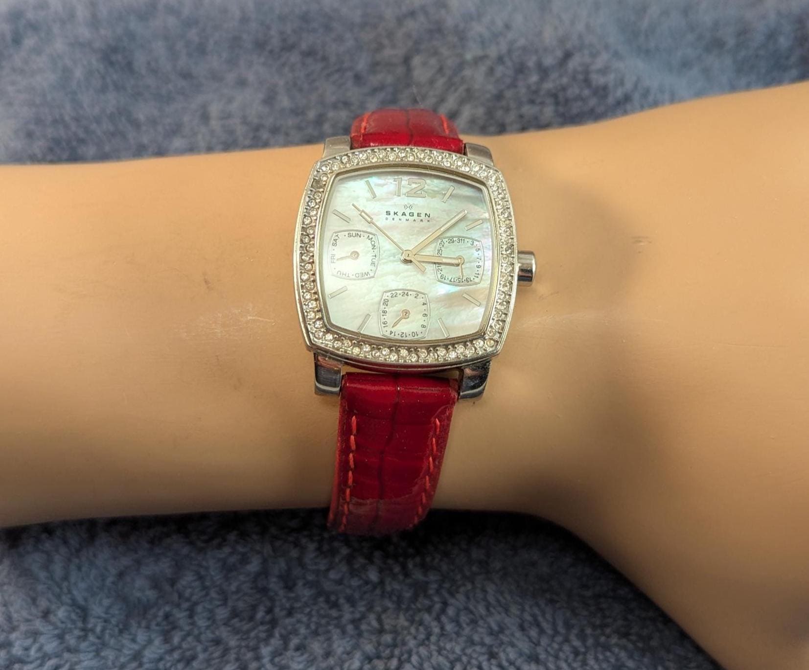 Elevate your style with this stunning Skagen Mother of Pearl Dial and Crystal BThis is a pre-owned Skagen Denmark ladies watch, reference 558SSLP4. It is an analog quartz timepiece powered by a battery, featuring a central second hand, a date indicator sub dial, day indicator sub dial and 12/24-hour dial. Made in Japan.