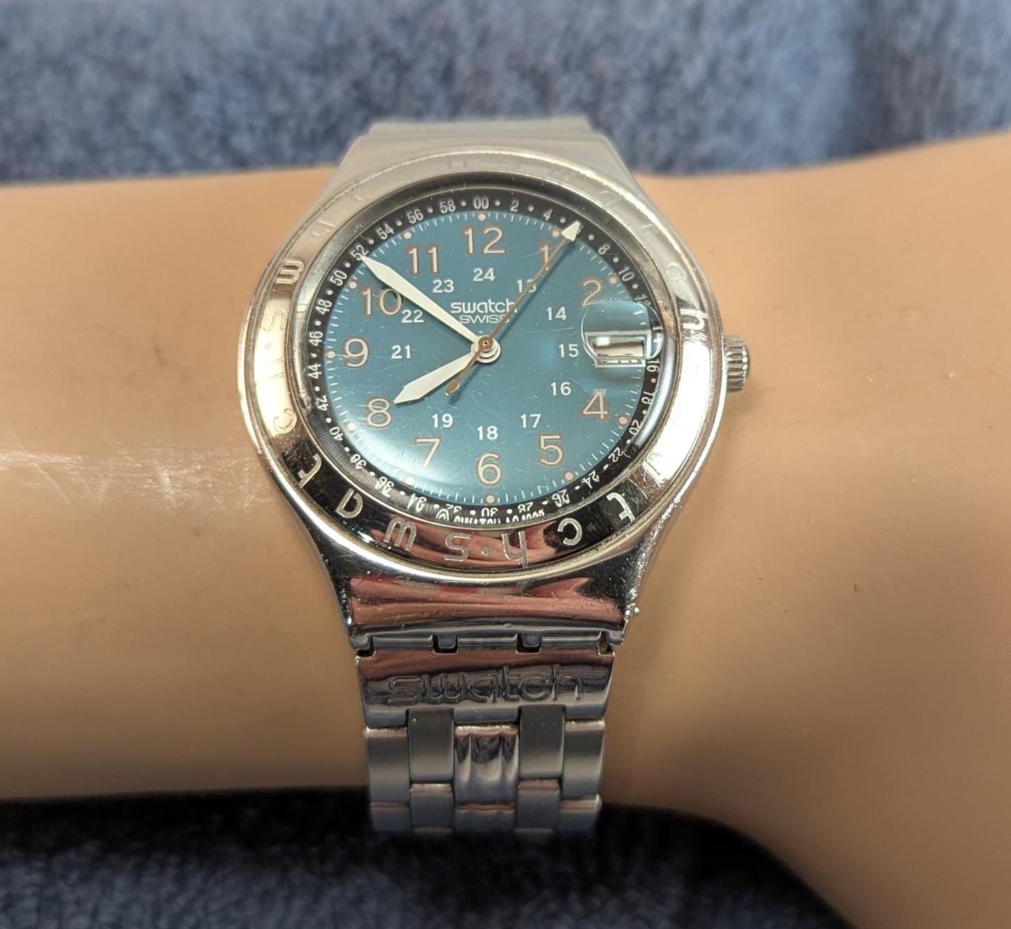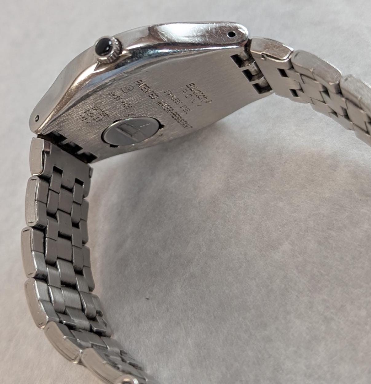 An interesting Swatch Irony Chronograph watch with a stainless steel case in good working condition with a new battery. Running and keeping time. The watch has some wear from use. Scuffs and scrapes to stainless case from use and age. Acrylic crystal has some scuffs and scratches which I've buffed out as much as possible. 1993 model year watch from Swatch.