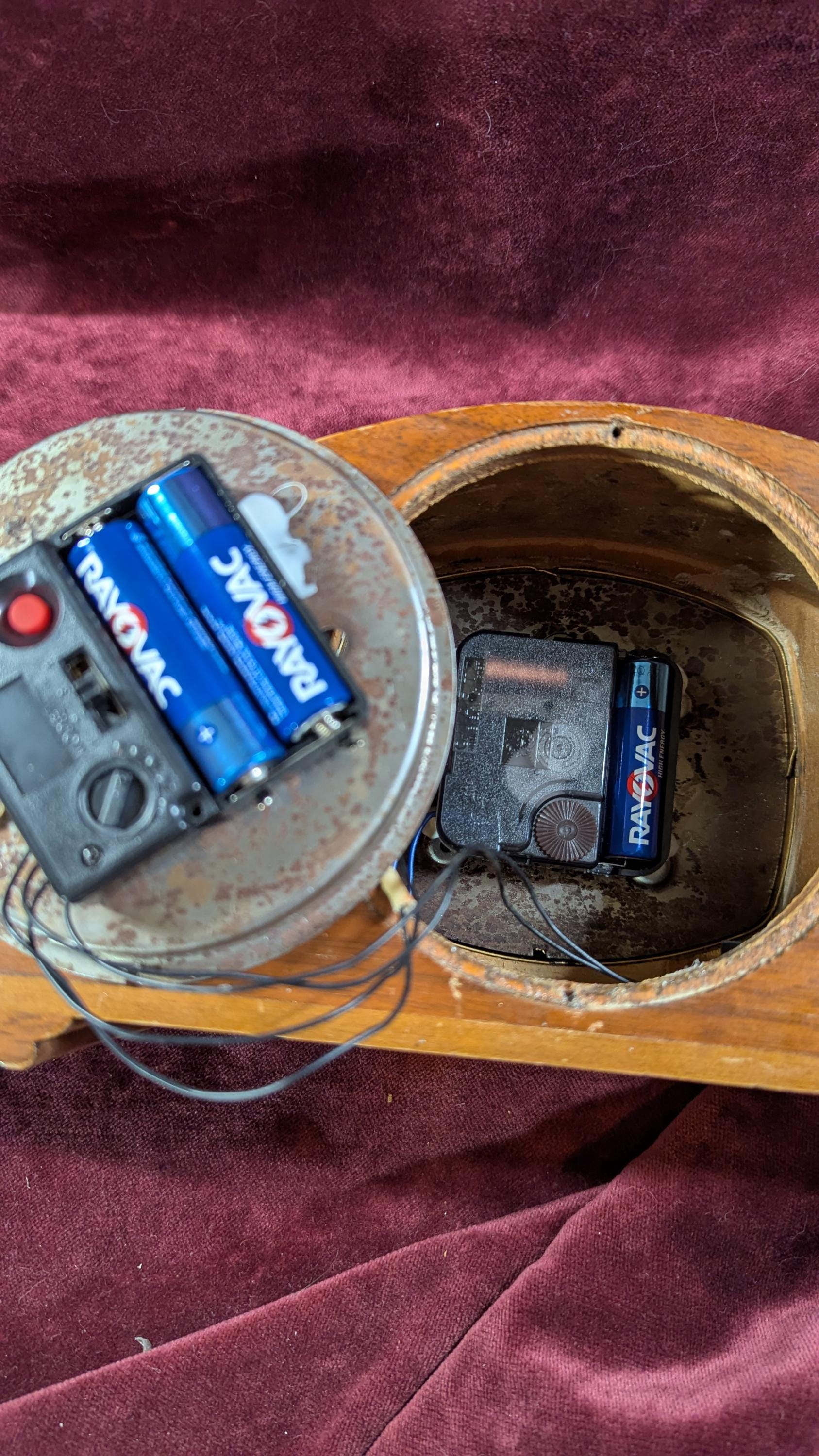 Movement runs quietly, functions well and keeps good time. Inside movement replaced by a good quality quartz battery movement so you get the vintage, antique style with a new battery movement. Hands and movement are not original to the clock. No second hand. Uses a "AA" battery, included in sale.