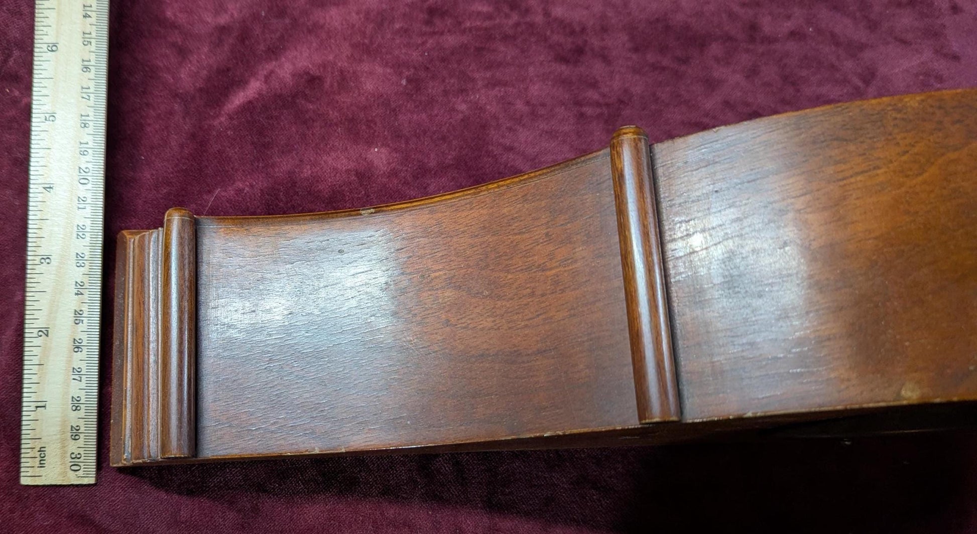 Get the best of both worlds with this very hard to find design and wonderful wood finish. A Rare, Vintage Ingraham Model Sentinel Strike mantle clock, circa 1940's. The classic mantle clock with wide and unique curvilinear wood case. Clock face has silver/gold design in the metal dial with black numerals. Comes with gold hour and minute hands. Measures about 6.5 inches high, 19.75 inches wide, and 3.5 inches deep. Has felt lined bottom pads. Squared convex glass over dial. Very easy to read black Arabic numbers.